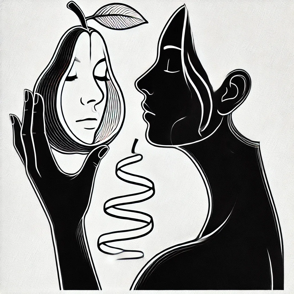 DALL·E 2025-01-23 14.23.33 - A minimalist black and white line art illustration of a figure peeling a pear, their face reflected in the shiny surface, showing contemplation and un.webp